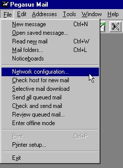 Open Pegasus Mail. Click on the File menu and choose "Network Configuration..."
